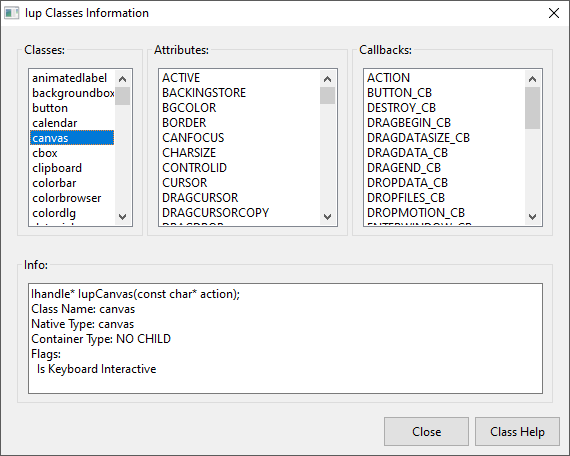 IupShow(IupClassInfoDialog(dlg)) shows the following: