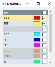 It uses the matrix columns to display labels, color boxes and check boxes in a way that is not possible using IupList. But the control mimics the IupList attributes, callbacks and interaction, so the usage by the programmer and by the user should be very similar. This is an additional control that depends on the IupControls library. Based on MTXLIB, developed at Tecgraf/PUC-Rio by Renata Trautmann and Andre Derraik. Returns the identifier of the created matrix. |