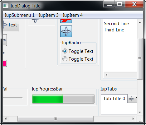 The box allows the application to create a virtual space for the dialog that is actually larger than the visible area. The current size of the box defines the visible area. The natural size of the child (and its children) defines the virtual space size. So the IupScrollBox does not depend on its child size or expansion, and its natural size is always 0x0, except for the first time when it expands to the child natural size (since 3.19). The user can move the box contents by dragging the background. Also the mouse wheel scrolls the contents vertically. The box can be created with no elements and filled dynamically using IupAppend() or IupInsert(). Inherits all attributes and callbacks of the IupCanvas, but redefines a few attributes. Notice that it is possible to use the IupScrollBox to overcome the internal scrollbars of another control like IupMatrix by making all cells visible, but this will force all cells to be drawn all the time even when not visible at the scroll box, which is much slower than the internal IupMatrix optimization. The IupFlatScrollBox is similar, except that its scrollbars are drawn, and it supports the FLATSCROLLBAR attribute(s). |